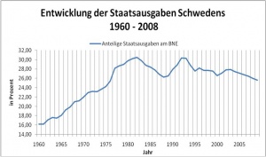Auf die Leistungsbilanz wirken sinkende Staatsausgaben ähnlich, da die Handelsbilanz, als Teil der Leistungsbilanz, diese stark beeinflusst. In Schweden ist zu erkennen, dass die Leistungsbilanz steigt. Mittelfristig gesehen, befindet sich die Leistungsbilanz von 1997 bis 2001 etwa auf einem Niveau.