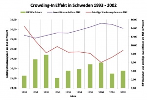 In einem zweiten Teil des Crowding-In wird das natürliche Produktionsniveau Yn betrachtet. Es sollte in der kurzen Frist sinken, da ein Rückgang der Staatsnachfrage ein Absinken der Produktion zur Folge hat. Mittelfristig, so die These, kehrt Yn auf die ursprüngliche Entwicklung zurück. Um Yn überhaupt in Betrachtung ziehen zu können, wird es mit dem BIP gleich gesetzt. In SWE lässt sich diese Aussage eingeschränkt treffen, zwar kommt es zunächst zu einem Anstieg des BIP-Wachstums um 5 % Punkte, aber in der Folge sinkt es gegenüber 1993 auf 2,3 % Wachstum im Jahr 1995 ab. Gründe für diese Entwicklung könnten in der Wirtschaftspolitik, dem Hype in der IT-Branche oder dem technischen Fortschritt liegen. In SWE ist Technischer Fortschritt ein seit Jahren geförderter Faktor, so ist das Land nach Deutschland eines der führenden Technologieländer in Europa. Beispielhaft hat Schweden die Produktivität in zehn Jahren nach 1994 um 50 % gesteigert. Weitere Aspekte für eine solche Entwicklung können in höheren Investitionen gegenüber einem Staatsausgabenrückgang liegen oder einem starken Staatsausgabenmultiplikator sowie einem erhöhten Außenbeitrag begründet sein.[4] Ebenfalls kann ein zunehmender Lageraufbau zu einen erhöhten BIP-Wachstum führen, so hatte SWE 1994 hohe Bestände und in Folge des Boom-Jahres 1995 sinkende Lagerhaltungen. Bei einer solchen Entwicklung kommt es zu keiner Veränderung des Produktionsniveaus.