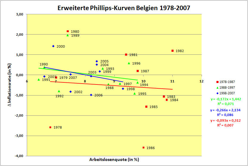Abbildung 6: Die erweiterten Phillips-Kurven Belgiens im Zeitablauf. Die Regressionsgeraden und Bestimmtheitsmaße für die Perioden 1978-1987, 1988-1997 und 1998-2007 sind jeweils angegeben. |