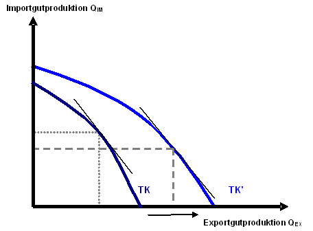 Durch den wirtschaftlichen Wachstum verschiebt sich die Transformationskurve nach außen. Vorliegend verschiebt sie sich stärker in Richtung des Exportgutes als zum Importgut. Dieses wird auch als einseitiges Wachstum in Richtung des Exportgutes bezeichnet. Folglich erhöht sich die Produktion, bei gegebenem Preisverhältnis, des Exportgutes und die des Importgutes sinkt.
