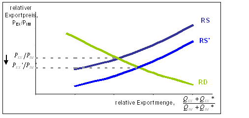 Auf Grund der Veränderung im Standardmodell des Außenhandels (relatives Weltangebot), wie oben beschrieben, sinkt der relative Preis des Exportgutes im Welthandelsgleichgewicht.