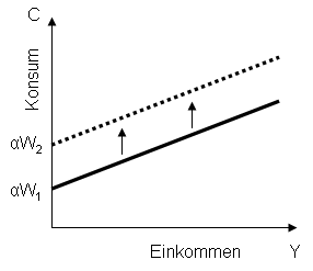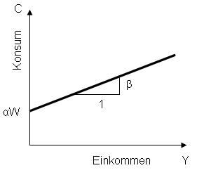 mit der marginalen Konsumneigung aus Vermögen α und der marginalen Konsumneigung aus Einkommen β.[12]