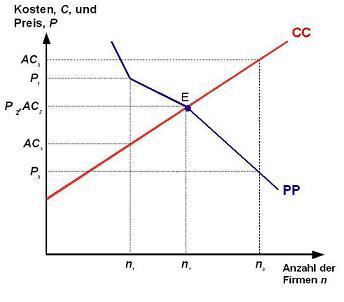 - Aus dieser Formel wird ersichtlich, dass mit steigendem Gesamtabsatz (S) und gleichbleibender Unternehmensanzahl (n) die Durchschnittskosten sinken. Vergleicht man zwei Märkte mit unterschiedlichem Gesamtabsatz (S) zeigt sich, dass die CC-Kurve des größeren Marktes unterhalb der des kleineren Marktes liegt. Das heißt, dass mehr Anbieter auf dem Markt aggieren können, damit die Produktvielfalt steigt und der Preis gleichzeitig sinkt.