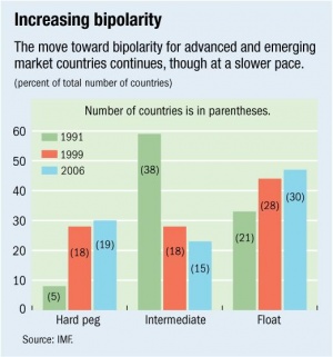 In den letzten Jahren ging die Tendenz bei den Wechselkurssystemen weg von den Zwischenlösungen (Intermediate) hin zu den "Ecklösungen". Diese Polarisierung zeichnet sich am einen Ende des Spektrums durch eine Verbreitung der Regime mit völlig flexiblen Wechselkursen (Float) und am anderen Ende durch einen ausgeprägten Trend zur Währungsintegration, also zur extremstmöglichen Form fixer Wechselkurse (Hard Peg), aus. Zwischen 1990 und 2004 ist die Zahl der Länder, die zu einem völlig flexiblen oder extrem rigiden Wechselkursregime übergegangen ist, stark angestiegen. Der Anteil unter den IWF-Mitgliedsländern ist von etwa einem Drittel auf etwas mehr als die Hälfte angestiegen. Hauptgrund dafür ist, dass die beiden Extremformen als krisenresistenter angesehen werden, als die Zwischenformen.[28]