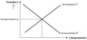 Flexible (freie) Wechselkurse entsprechen dem Prinzip einer marktwirtschaftlichen Preisbildung auf dem Devisenmarkt. Die Kursbildung erfolgt ausschließlich durch das Zusammentreffen von Angebot und Nachfrage, d. h. grundsätzlich ohne staatliche Eingriffe. Der Marktmechanismus auf dem Devisenmarkt, der sogenannte Wechselkursmechanismus, sorgt dafür, dass die Angebots- und Nachfragemengen zum Gleichgewichtskurs übereinstimmen (Devisenmarktgleichgewicht).[2]Die Wechselkursbildung zwischen dem Dollar und dem Euro erfolgt beispielsweise nach diesem Prinzip.