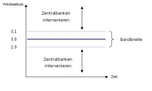 In Systemen fixer (fester) Wechselkurse vereinbaren die beteiligten Länder einen festen Leitkurs, die sogenannte Parität, und versuchen diesen durch Interventionen konstant zu halten. Der Wechselkurs kann dabei von der Zentralbank an eine andere Währung oder aber an einen Währungskorb gebunden werden. Die Wechselkurse von Ländern mit einem System fixer Wechselkurse sind jedoch nicht grundsätzlich unveränderlich. Spricht man von festen Wechselkursen sind meist Bandbreitensysteme gemeint, bei denen die Wechselkurse innerhalb bestimmter Bandbreiten (z.B. +/- 1 %) von den zentralen Paritäten abweichen können.[13]